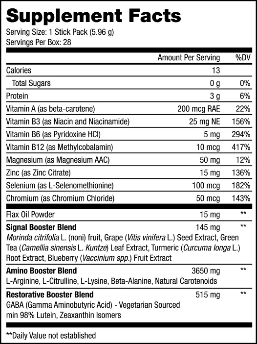 Restorative Booster Blend: GABA (Gamma-Aminobutyric Acid), Lutein and Zeaxanthin Isomers support quality sleep, critical for natural HGH production.