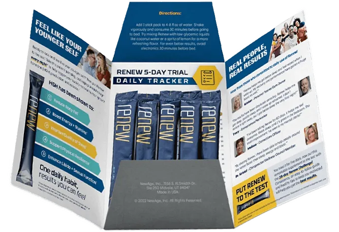 Renew is a patent-pending, anti-aging supplement that helps trigger your body's natural growth hormone (HGH) production and release. HGH helps:
